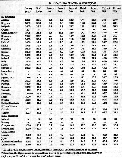 The table below shows the distribution of income or consumption in EU countries around 2000 in comparison with the United States, Russia and some other comparators. Most interesting is the Gini index, which is the Gini coefficient expressed as a percentage. This is a measure of inequality of income or wealth distribution. The lower the percentage, the more equal the wealth distribution in the country. The table shows that all 27 EU member states show a percentage far below the United States and Russia, which means that wealth is distributed much more equally in Europe. The European countries with the most equal distribution of income are Denmark (24.7), Sweden (25.0) and Finland (26.9) from the "old" EU countries, Slovakia (25.8), Hungary (26.9) and the Czech Republic (25.4) from the "new" EU countries, this of course on a lower per capita income level than the "old" EU countries. The countries with the biggest welfare gap in Europe are the Baltic States (between 35.8. and 37.7) in the "new" EU member states and Portugal (38.5), Italy (36.0) and Great Britain (36.0) in the "old". In Europe Austria (29.1) lies somewhere in the middle. These European figures have to be compared with Russia (39.9) and the USA (40.8).