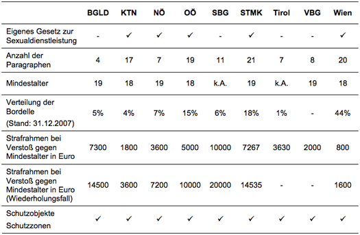 Tabelle 1: Übersicht über die gesetzlichen Grundlagen zur Sexualdienstleistung in den einzelnen österreichischen Bundesländern (verfügbar unter: http://www.ris.bka.gv.at/)