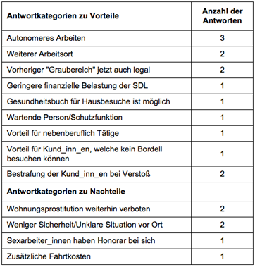 Bezüglich etwaiger Nachteile der neuen Regelung wurde u. a. angemerkt, dass die Wohnungsprostitution in Oberösterreich weiterhin verboten ist. Dies bedeutet, dass Hausbesuche bei Kund_inn_en zwar erlaubt, jedoch sexuelle Dienstleistung in einer eigens dafür angemieteten Wohnung weiterhin illegal sind. Des Weiteren wurden ein erhöhtes Gefährdungspotential sowie finanzielle Mehrkosten der Sexdienstleister_innen im Kontext von Hausbesuchen als nachteilig erwähnt (siehe Tabelle 5).