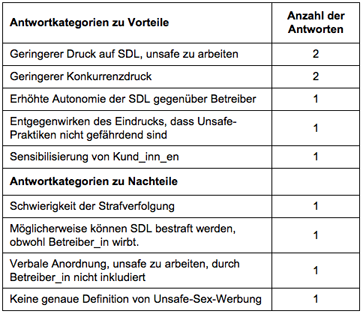 Die vierte relevante Gesetzesänderung betrifft das Unsafe-Sex-Werbeverbot. Zu diesem Fragebereich nahmen wieder alle drei Beratungseinrichtungen Stellung. Insgesamt wurden sieben Statements zu den Vorteilen und vier zu den Nachteilen abgegeben (siehe Tabelle 7), d.h. diese Gesetzesnovellierung wird mit Blick auf die Anzahl der genannten Aspekte wieder tendenziell positiv gesehen. Inhaltlich machen die genannten Vorteile deutlich, dass dadurch einerseits der Druck auf die Sexarbeiter_innen bezüglich Gesundheitsgefährdung sowie Konkurrenz reduziert wird und andererseits die Autonomie in der Ausübung ihrer Tätigkeit erhöht wird. Als nachteilig werden Schwierigkeiten in der Strafverfolgung sowie Unschärfen in der Formulierung des Gesetzestextes gesehen (siehe Tabelle 7).
