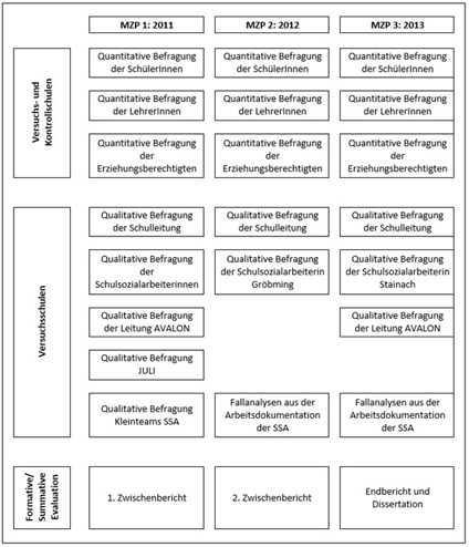 Das bedeutet, dass die Daten in einem Zeitraum von drei Jahren (November 2010 bis einschließlich Dezember 2013) erhoben und dadurch ein mehrjähriger Wirkungsverlauf darstellbar wurde. Um zudem festgestellte Wirkungen auf die Maßnahme Schulsozialarbeit kausal rückführen zu können, wurden alle Erhebungen nicht nur an Schulen mit Schulsozialarbeit (Versuchsgruppen: HS Stainach, HS Gröbming14) sondern auch an Schulen ohne Schulsozialarbeit (Kontrollgruppen: HS Leutschach, HS St. Ruprecht/R) durchgeführt15. Dieses längsschnittliche und quasiexperimentelle16 Forschungsdesign (vgl. Abbildung 1)17 ist für Österreich einzigartig und gehört insgesamt für den deutschsprachigen Raum zur Ausnahmeerscheinung im Bereich der Beforschung von Schulsozialarbeit (vgl. Speck et al. 2010: 312ff).