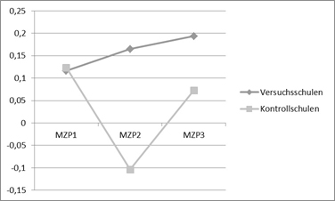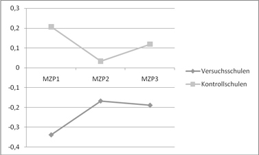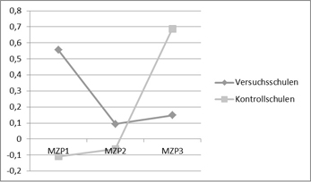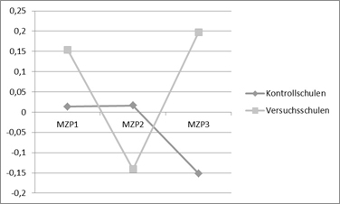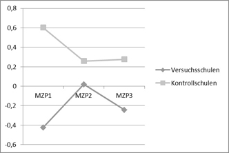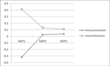 Neben der positiveren Persönlichkeitsentwicklung zeigt sich an Versuchsschulen insbesondere auch für den Umgang mit Konflikten ein Effekt der SSA. So ist die verbale Konfliktlösekompetenz von SchülerInnen an Schulen mit Schulsozialarbeit im Gegensatz zu SchülerInnen an Kontrollschulen gestiegen. Dabei ist diese Konfliktlösekompetenz der Kinder an Schulen ohne Schulsozialarbeit deutlich gesunken (vgl. Abbildung 14).