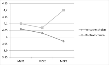 Zum anderen werden Kinder, die eine Schule mit Schulsozialarbeit besuchen, zunehmend sicherer in ihrem Verhalten und auch in ihren Entscheidungen, während bei Kindern in Kontrollschulen diese Sicherheit im selben Untersuchungszeitraum sinkt (vgl. Abbildung 13).