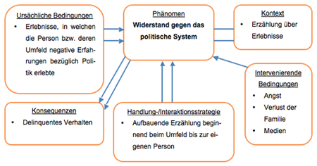 Während des Gespräches erklärte die interviewte Person Handlungen oder Ereignisse, an die er sich erinnerte. Im Folgenden wird das Phänomen anhand des paradigmatischen Modell dargestellt.
