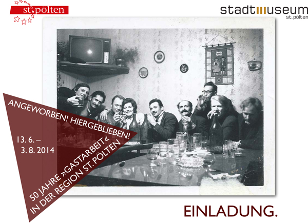 Viele lokale Initiativen nahmen den 50. Jahrestag des österreichisch-türkischen Anwerbeabkommens zum Anlass, um diese jüngere Geschichte der Arbeitsmigration – sei es in Form von Ausstellungen, Veranstaltungen oder anlaufenden Sammlungsprojekten – stärker sicht- und bearbeitbar zu machen.2 St. Pölten reihte sich mit zwei Aktivitäten in diesen Trend ein: Im St. Pöltener Stadtmuseum wurde von 13.06.-14.09.2014 die Ausstellung „Angeworben! Hiergeblieben! 50 Jahre ‚Gastarbeit‘ in der Region St. Pölten“ gezeigt (siehe Abbildung 1). In Kooperation mit der FH St. Pölten entstand zudem das 30-minütige studentische Filmprojekt „50 Jahre ‚Gastarbeit‘: Wege der 1., 2. und 3. Generation“. Wir stellen mit diesem Werkstattbericht beide Projektaktivitäten vor und unterziehen diese einer kritischen Reflexion.