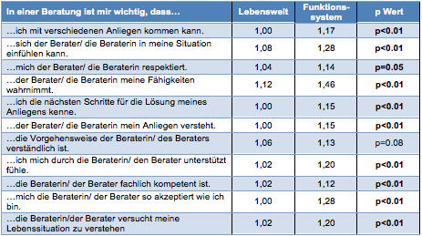 Allgemeine Beratungskompetenzen, wie zum Beispiel Einfühlungsvermögen, Respekt, Akzeptanz oder die fachliche Kompetenz werden von KlientInnen, die eine lebensweltliche Beratung in Anspruch nehmen, ebenfalls als wichtiger eingeschätzt als von KlientInnen, die ein funktionssystemisches Anliegen haben.