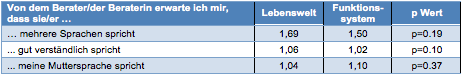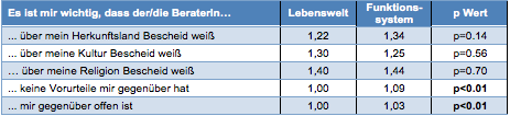 Unterschiede zwischen den beiden Gruppen gab es hinsichtlich der Einschätzung der allgemeinen und der transkulturellen Kompetenzen der BeraterInnen. Transkulturelle Kompetenzen, wie zum Beispiel Vorurteilsfreiheit oder Offenheit genießen in Beratungssettings, in denen persönliche Belange der KlientInnen bearbeitet werden, größere Wichtigkeit als in Beratungssettings, in denen es um Funktionssysteme geht. KlientInnen mit lebensweltlichen Anliegen schätzen die Vorurteilsfreiheit und Offenheit der BeraterInnen als signifikant wichtiger ein als KlientInnen mit funktionssystemischen Anliegen.