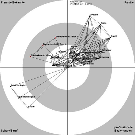 Die Vorgehensweise ist folgende: Für die Erstellung der Netzwerkkarte wird eine Ankerperson gewählt - in unserem Fall die Interviewperson -, die das Zentrum des Netzwerkes bildet. Ausgehend von der Ankerperson werden die Kontakte der Person durch Punkte in vier Sektoren, die durch Linien voneinander getrennt sind, eingetragen. Diese vier Sektoren sind: Freunde/Bekannte, Familie, Schule/Beruf und professionelle Beziehungen. Je wichtiger die Person für die Ankerperson ist, desto näher wird sie zur Ankerperson eingezeichnet. Ist Kontakt zwischen zwei Personen vorhanden, so wird dieser mit Hilfe einer Linie zwischen zwei Punkten (Personen) gekennzeichnet. Die Dichte des Netzwerkes lässt sich anhand einer Formel (Dichte = n/{[N(N-1)] / 2}) berechnen. Wobei "n" die Personenpaare, die sich kennen und miteinander Kontakt haben (ohne Ankerperson) und "N" die Summe der Personen im System (ohne Ankerperson) bezeichnet. Die Interpretation des Netzwerks erfolgt anhand von Schlüsselpositionen und Beziehungsformen im Netzwerk in verschriftlichter Form (vgl. Pantucek 2005:141-150). Das Computerprogramm erleichterte die rechnerische Auswertung der Netzwerkkarten.