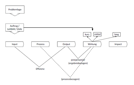 Das eigene professionelle Handeln an Zielen auszurichten und damit bestimmte Effekte zu beabsichtigen ist an sich kein neues Feld (vgl. Polutta 2010). Auch im Rahmen von Evaluationen ist die analytische Unterscheidung von Policy-/Struktur-, Prozess- und Erfolgs-/Wirkungsebene gebräuchlich. Was sich mit der Implementierung der Wirkungsorientierung als Steuerungsinstrument verändert, ist die enge Koppelung mit Effizienz und die verbindliche Festlegung dieser Perspektive. Dies zeichnete sich in Österreich schon viele Jahre vor der 2009 erfolgten Festschreibung der wirkungsorientierten Verwaltungsführung ab, die in Form des Bundeshaushaltsgesetz 2013 auf Bundesebene ab 1. Jänner 2013 in Kraft tritt2.