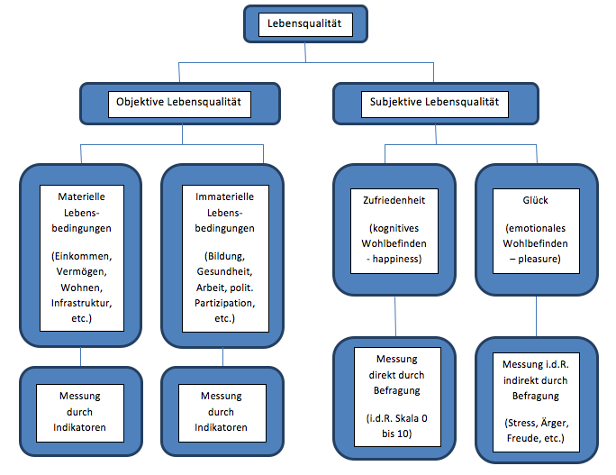 Mit Lebenszufriedenheit wird hier ein subjektives Wohlbefinden angesprochen, womit die im Zentrum der ökonomischen Glücksforschung stehende Zufriedenheit mit dem Leben gemeint ist, im Gegensatz zum Glücklichsein in Form positiver oder negativer Gefühle im Moment. (Vgl. P. 2012, Ruckriegel 2012b: 100f und Ruckriegel 2008: 309; Vgl. zu Messmethoden des Glücks Frey/Frey-Marti 2010: 27-33)