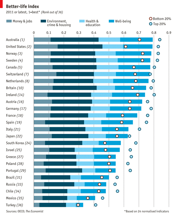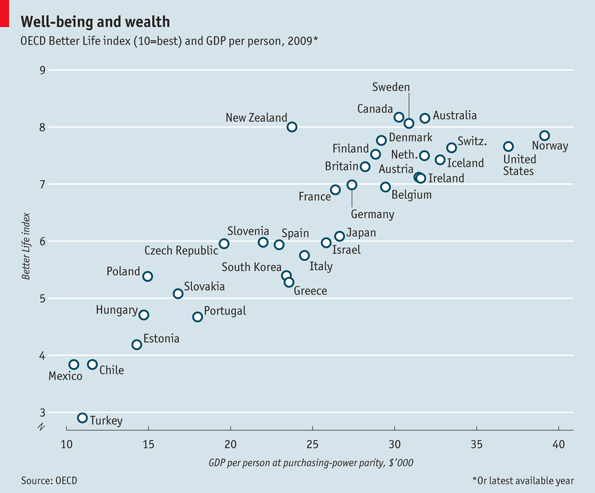 Die Studie „How’s Life? Measuring well-being“, von der OECD am 12. Oktober 2011 herausgegeben, bietet ein umfassendes Bild der Faktoren, die das Leben von Menschen in 40 Ländern ausmachen. Der Report bewertet 11 spezifische Lebensaspekte – von Einkommen, Jobs und Wohnsituation bis zu Gesundheit, Bildung und der Umwelt – als Teil der laufenden Bemühungen der OECD, neue Maßgrößen zur Bewertung des Wohlergehens zu entwickeln, die über das BIP hinausgehen.20 Die Studie legt das Schwergewicht auf Haushalte und Individuen und nicht auf die Gesamtentwicklung der Ökonomie.