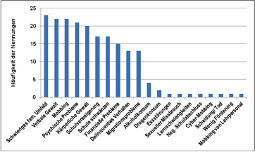 Bezüglich der Problemlagen der SchülerInnen, mit denen die SchulsozialarbeiterInnen in den letzten sechs Monaten konfrontiert waren, zeigte sich ein vielschichtiges Bild (siehe Abbildung 1): An der Spitze rangieren Schwierigkeiten im familiären Umfeld, dicht gefolgt von verbaler Gewalt, Mobbing von SchülerInnen, psychischen Problemen und körperlicher Gewalt. Im Mittelfeld liegen Themen, wie Schulverweigerung, Schule schwänzen, finanzielle Probleme im Elternhaus, delinquentes Verhalten von SchülerInnen und Migrationsprobleme. Suchtverhalten (z. B. Alkoholkonsum, Drogenkonsum, Essstörungen), sexueller Missbrauch und Lernschwierigkeiten spielen in der Beratung der SchülerInnen eine geringe Rolle.