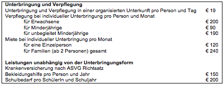 Die enge Bemessung des Lebensbedarfs ist eine der Kernherausforderungen, mit denen BezieherInnen zu kämpfen haben. Die Grundversorgungsleistungen umfassen gem. Art. 6 GVV die Unterbringung „unter Achtung der Menschenwürde und unter Beachtung der Familieneinheit“ (leg.cit.), sowie Kostenhöchstsätze für Verpflegung, Taschengeld und Mietzuschuss im Falle einer privaten Unterbringung. Die geringe Höhe ist menschenrechtlich bedenklich (vgl. Frahm 2013).
