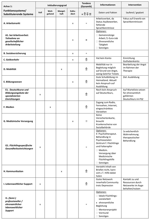 Sein Bruder Elias hingegen lebt infolge einer Umverteilung in einem kleinen Dorf. Auch er ist traumatisiert. Aufgrund seiner psychischen Beschwerden hat eine engagierte Ehrenamtliche für ihn vermittelt, dass ein Psychiater in der Kreisstadt ihm unentgeltlich einen Gesprächstermin gibt. Ein Mitbewohner aus dem Heim übersetzt.Elias ist damit nur als „mangelhaft inkludiert“ einzuordnen. „Mangelhaft inkludiert“ ist eine Person, deren Zugang zu Leistungen der medizinischen, therapeutischen und pflegerischen Versorgung beeinträchtigt ist, z. B. durch das Fehlen geeigneter Dienste in erreichbarer Nähe, durch Angst vor der Nutzung, durch Sprachprobleme etc. Damit Elias als voll inkludiert in das Funktionssystem Gesundheit einzuordnen wäre, müsste er über ausreichende Deutschkenntnisse verfügen, um sich im System der öffentlichen Gesundheitsversorgung bewegen zu können, er müsste Mitglied einer Krankenversicherung sein und außerdem über genügend finanzielle Mittel verfügen, um Fahrtkosten zu zahlen. Wenn er die benötigten Leistungen dann entsprechend seines Bedarfs in Anspruch nehmen würde, ohne weitere innere oder äußere Barrieren, gälte er als voll inkludiert. Ein weiter, steiniger Weg für einen Geflüchteten in Deutschland.
