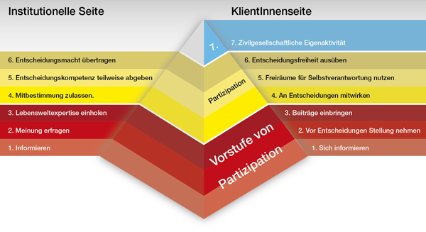 Die linke Seite der Grafik (Abbildung 1) stellt die verschiedenen Ebenen der Beteiligungsmöglichkeiten in Einrichtungen dar. Die rechte Seite zeigt die Seite der KlientInnen und die verschiedenen Möglichkeiten ihrer partizipativen Aktivitäten. Die höchstmögliche Stufe der KlientInnen, die so genannte „zivilgesellschaftliche Eigenaktivität“ ist nur auf der Seite der KlientInnen angesiedelt, da auf dieser Ebene selbstständig, ohne institutionelle Unterstützung, Ziele verfolgt werden. Daraus resultiert die halbierte Pyramidenspitze. Die Partizipationspyramide bietet eine inhaltliche Orientierung, wie Partizipation gestaltet werden kann. Diese Darstellung wird im folgenden Abschnitt ergänzt durch die Vorstellung internationaler Modelle der NutzerInnenbeteiligung, welche mögliche Rahmenbedingungen und Gestaltungsmöglichkeiten von Partizipation aufzeigen und die Etablierung neuer Projekte in Österreich unterstützen soll.