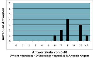 Abschließend wurden die Interviewpartner/innen gebeten, die Notwendigkeit eines Beschäftigungsprojekts nach Vorbild von KAMA Wien für den Raum Linz einzuschätzen. 0 bedeutete, dass so ein Projekt nicht notwendig ist, und 10, dass so ein Projekt unbedingt notwendig ist. Die Einschätzung zu dieser Frage bewegt sich auf der Skala deutlich auf der positiven Seite (siehe Abbildung 4). Jene Person, welche die Notwendigkeit mit 6 am niedrigsten einstufte, meinte, dass der Arbeitsmarktzugang eine 10 verdienen würde. Insgesamt wurde die Notwendigkeit in unterschiedlichem Ausmaß von allen interviewten Personen als gegeben eingestuft.