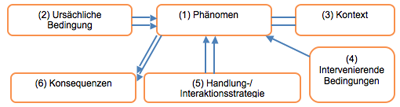 Die gewonnenen Erkenntnisse dieser Forschung werden anhand des paradigmatischen Modells laut Wagner (2000) präsentiert. Hierbei wird das beobachtete Phänomen (1), welches immer zentral positioniert ist, beschrieben. Die ursächliche(n) Bedingung(en) (2) werden im linken Teilbereich angeführt. Rechts davon steht der Kontext (3), welcher beschreibt, wie sich das Phänomen darstellt. Darunter werden die intervenierenden Bedingungen (4) angeführt. Sie stellen Einwirkungen auf das Phänomen dar. Im Bereich Handlungs-/Interaktionsstrategie (5) werden Aktionen beschrieben, die auf das Phänomen wirken. Im Feld Konsequenzen (6) werden die Auswirkungen des Phänomens dargestellt.