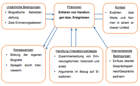 Während des Gespräches erklärte die interviewte Person Handlungen oder Ereignisse, an die er sich erinnerte. Im Folgenden wird das Phänomen anhand des paradigmatischen Modell dargestellt.