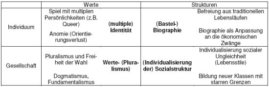 Die Tabelle zeigt nun in vier Segmenten die Folgen der gesellschaftlichen Öffnungs- und Schließungstendenzen: Auf der individuellen Ebene sind es Möglichkeiten der Lebensgestaltung in Identität und Biographie, während auf der anderen Seite nur mehr Anpassung an die Notwendigkeiten der Existenzsicherung und eine entsprechende Unsicherheit folgen. Auf der gesellschaftlichen Ebene ist es vor allem der Unterschied zwischen einem Segment der Gesellschaft, das sich in immer wieder neuen Lebensstilen Möglichkeiten der Gestaltung des Daseins schafft, während auf der anderen Seite eine neue Klasse von Armen entsteht (Arme, von Armut gefährdete, "prekärer Wohlstand" - je nach Definition 15% - 25%) - eine Klasse , aus der es fast kein Entkommen mehr gibt, wenn man einmal dort gelandet ist (siehe auch z.B. Hartz IV).