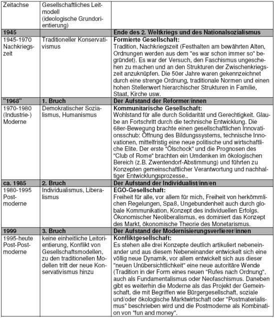 Viele Daten zeigen, dass sich in den letzten Jahren das Muster des gesellschaftlichen Wandels deutlich veränderte hat, das Neue kann nur als Post-Postmoderne bezeichnet werden. Individualisierung, Pluralisierung und Globalisierung brachten auch viele neue Ungleichheiten, nicht nur ökonomische, in die Gesellschaft: Für die Gruppe, welche diese Chancen nützen konnte, waren diese Veränderungen ein Zugewinn von Freiheit in der Lebensgestaltung. Die anderen fühlten sich in ihrer gesellschaftlichen Position durch Abstieg bedroht oder erlebten einen Verlust der bisher gewohnten Orientierungsmuster, sie blieben im sozialen Wandel zurück. Nun - so die Hypothese - erfolgt ein "Kampf" um neue Strukturen der Gesellschaft unter den Vorzeichen einer Wiedergewinnung von als hilfreich erlebten Sicherheiten: Normen und Institutionen werden wieder mehr bejaht; man zieht sich wieder mehr auf die kleinen Lebensräume (Familie, Gemeinde, Region) zurück; autoritäre und fundamentalistische Tendenzen verstärken sich. Wird unsere Gesellschaft - in dem so beschriebenen Sinne - nun post-postmodern? Kann man den Begriff vom "Europa der zwei Geschwindigkeiten" übertragen auf ein "Österreich der zwei Geschwindigkeiten" mit allen Reibungen und möglichen Brüchen, die dieser Prozess für die Gesellschaft mit sich bringt? Man könnte die als postmodern bezeichnete Periode dadurch charakterisieren, dass es zumindest den Grundkonsens gab, dass niemand eine absolute Wahrheit besitzt. Dadurch standen unterschiedliche Wertvorstellungen relativ konfliktfrei nebeneinander. Was sich geändert hat, ist das Ende dieses Konsenses und ein Kampf um die Hegemonie eines bestimmten Wertemodells hat begonnen. Fundamentalismen gab es schon länger, aber sie waren noch auf den religiösen Bereich beschränkt (z.B. "Neuer Kirchenkurs"). Was sich zu ändern scheint, ist, dass sich die Verlierer (und Verliererinnen?) dieser Phase organisieren (nun auch publizistisch und politisch) und den Konsens aufgekündigt haben: Es geht nun sehr stark darum, welches Wertemodell in der Gesellschaft dominant wird. Die Bruchlinien können beschrieben werden, aber was aus diesen entstehen wird, muss offen bleiben.
