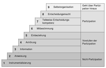 Unger (2012: o. S.) sieht Partizipation nur dann als gegeben an, wenn Personen mit Entscheidungsmacht ausgestattet sind, und befähigt sind oder werden, Entscheidungen auch tatsächlich zu treffen. Wenn dies nicht der Fall ist, ist die Befähigung zur Mitgestaltung, also Empowerment notwendig.