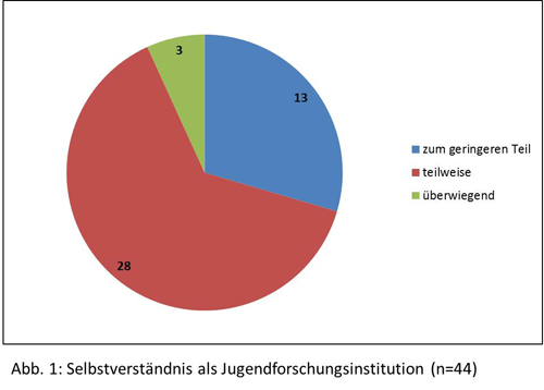 Ausgehend von der bereits erwähnten Feststellung, dass Jugendforschung in einer disziplinären und inhaltlichen Vielfalt betrieben wird und es keine einheitliche Begriffsdefinition von Jugendforschung gibt, wollten wir in unserer Untersuchung keine Einrichtung von vornherein aus- oder einschließen. Wir haben uns daher für ein Vorgehen entschlossen, das vom Selbstverständnis der Institutionen ausgeht: Voraussetzung für die Teilnahme von Institutionen an unserer Befragung war, dass sie Jugendforschung als eine ihrer legitimen Aufgaben betrachten. Das bedeutete für uns nicht, dass sie sich überwiegend als Jugendforschungseinrichtung verstehen mussten oder die Aktivitäten in diesem Arbeitsbereich sichtbar die Außenwahrnehmung der jeweiligen Institution prägten. Insofern ist es aufschlussreich, einen genaueren Blick darauf zu werfen, in welchem Umfang bei den befragten Einrichtungen von einem entsprechenden Selbstverständnis auszugehen ist.