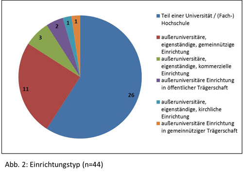 Werden die Institutionen gemäß der von uns vorgegebenen Auswahl nach dem Einrichtungstyp differenziert, so wird deutlich, dass in unserer Stichprobe mit 26 Institutionen diejenigen das Gros der Befragten stellen, die „Teil einer Universität/Hochschule“ sind. 12 Institutionen lassen sich als „außeruniversitäre, eigenständige, gemeinnützige Einrichtung“ charakterisieren; darunter eine, die sich explizit als „kirchliche“ Einrichtung versteht. Drei Institutionen sind „außeruniversitäre, eigenständige, kommerzielle/privatwirtschaftliche Einrichtungen“, bei zwei Institutionen handelt es sich des Weiteren jeweils um eine „außeruniversitäre Einrichtung in öffentlicher Trägerschaft“. Eine Institution stellt eine „außeruniversitäre Einrichtung in gemeinnütziger Trägerschaft“ dar (siehe Abbildung 2).