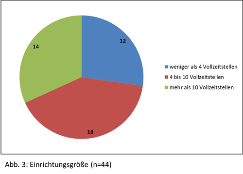 Hinsichtlich der Einrichtungsgröße verfügen 12 Institutionen offenbar über „weniger als 4 Vollzeitstellen“, bei 18 Institutionen ist von „4 bis 10 Vollzeitstellen“ auszugehen, während die Rückmeldungen von 14 Institutionen auf „mehr als 10 Vollzeitstellen“ schließen lassen (siehe Abbildung 3).