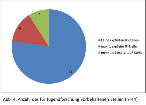 Auch wenn die jeweilige Institution eine vergleichsweise ansehnliche Größe aufweist, kann in der Regel nicht davon ausgegangen werden, dass es dort Stellen gibt, die speziell der Jugendforschung vorbehalten wären. Angesichts des Umstands, dass sich nur die wenigsten Institutionen überwiegend als Jugendforschungsinstitutionen begreifen (vgl. 3.1.) und primär wohl auch ein deutlich weiter gefasstes bzw. anders akzentuiertes Aufgabenspektrum abzudecken haben, ist das zunächst nicht weiter verwunderlich. Im Interesse einer möglichst präzisen Einschätzung der Jugendforschung sind wir diesem Aspekt aber trotzdem etwas genauer nachgegangen.
