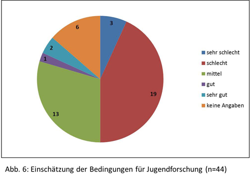 Die Bedingungen für Jugendforschung in Österreich werden vor diesem Hintergrund von den befragten Einrichtungen überwiegend als nicht gut eingeschätzt. 22 Institutionen, exakt die Hälfte der Befragten, bewerten sie ausdrücklich negativ, davon drei Institutionen als „sehr schlecht“. 13 Institutionen schätzen sie als „mittel“ ein. Lediglich drei Institutionen nehmen die Bedingungen für Jugendforschung in Österreich explizit positiv wahr, zwei davon als „sehr gut“. Sechs Institutionen haben sich einer entsprechenden Einschätzung enthalten, zum Teil weil ihnen die Jugendforschung als Arbeitsfeld strukturell nicht hinreichend vertraut ist, um hierzu fundiert Stellung beziehen zu können (siehe Abbildung 6).