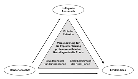 Neben dem konkreten Einsatz von Menschenrechten und der Notwendigkeit entsprechender Schulungen und praxisnaher Zugänge für Praktiker_innen, stellen die ethische Reflexion und der damit verbundene Einsatz von Berufskodizes ein wichtiges Instrument für professionelles Handeln dar. Es gilt, die notwendige Verbindung zwischen wissenschaftlichem Ethikdiskurs und praktischer Anwendbarkeit ethischer Prinzipien herzustellen.