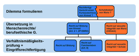 In einem weiteren Schritt gilt es nun, das identifizierte Dilemma in konkrete menschenrechtliche Ansprüche der Klient_innen zu formulieren, die in der gegenständlichen Fallvignette in Hinblick auf Ahmed beispielsweise darauf Bezug nehmen könnten, inwiefern sein Recht auf Bildung nach Art. 2 1. ZP der Europäischen Menschenrechtskonvention (EMRK) von Bedeutung ist und bei jeder Entscheidung einen Stellenwert eingeräumt wird. In Hinblick auf Marias Rechte als mögliches Opfer wiederum wäre z. B. der Schutz der Frauenrechtskonvention (CEDAW) (Schutz weiblicher Opfer vor sexuellen Übergriffen und Recht auf sexuelle Integrität) mitzudenken und danach zu fragen, welche Entscheidungen und Vorgangsweisen dieses fundamentale Recht beeinträchtigen könnten. Das Recht auf Familienleben und Privatsphäre der Klient_innen nach Art. 8 EMRK ist überdies ein Grundrecht, in das Sozialarbeit häufig (wenn auch durchaus manchmal unbeabsichtigt) eingreift und muss daher grundsätzlich immer mit bedacht und reflektiert werden, selbst wenn es im konkreten Einzelfall, wie hier in Bezug auf den Kursteilnehmer Ahmed, letztlich keine Relevanz hat.